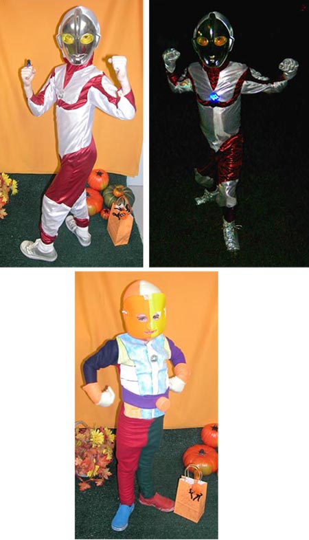 2006 Ultra Man and Color Boy. My oldest son decided to be Ultra Man, my husband found the mask online and I hand stitched the outfit. I used his pjs as a template for the basic pattern. My youngest son imagined Color Boy himself and told me what he looked like so I could create his costume. Both Boys were ecstatic about their outfits. |